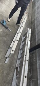 中でも大物の脚立は非常に長く、このままではトラックに載せられません😵💦 そこで現地で**セーバーソー(電動ノコギリ)**を使って脚立を半分に解体し、問題なく積み込み完了!
