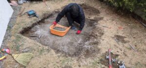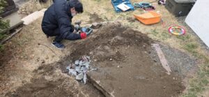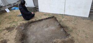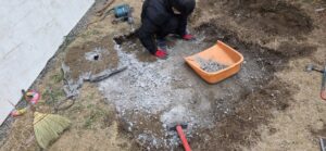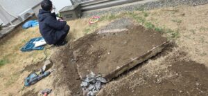 お庭の土に埋まった、巨大な土間コンクリートです。周囲はレンガブロックで囲まれており、見た目以上に深さがありました。しかもこれ、ただのコンクリではなく「硬化剤」が入った超高強度仕様!