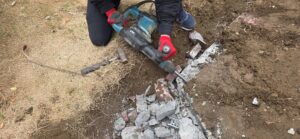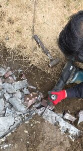 まずは専用のハツリ機に電源を繋ぎ、ひたすら打撃を与えて亀裂を入れていきます。硬化剤のせいで、並大抵の振動では壊れません…!大型ハンマーとハツリ機を交互に使い、斜めから角度をつけて衝撃を